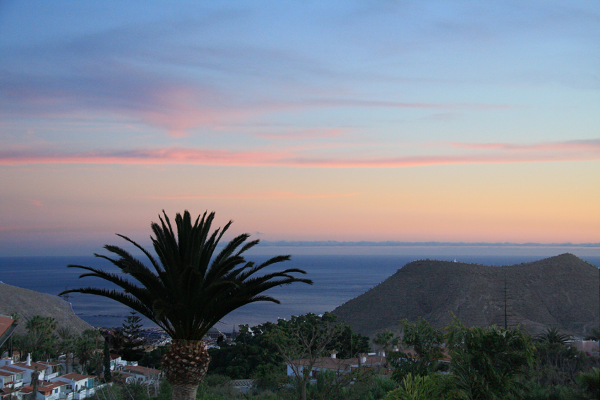 Tre bilder: den översta visar utsikten från vår terrass en vacker kväll, bilden i mitten visar samma vy en morgon då molnen bildade en grå vägg och skymde all utsikt mot havet och bilden underst visar hur de låga molnen sveper in över bergen.