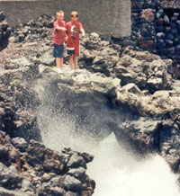 Vattnet strittar högt upp ur en grotta på El Hierro och killarna måste naturligtvis gå så nära som möjligt
