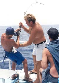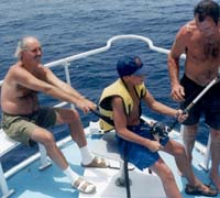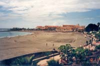 En strand får ansiktslyftning Hösten 1995 blev stranden ”Las Vistas” nedanför vår bar färdig. Projektet inleddes sommaren 1994. Strandpromenaden skulle breddas och hela sträckan mellan hamnpiren och piren mittemot skulle bli en lång fin sandstrand. Först byggdes pirarna ut. Halva strandremsan hade bestått av en kort strand med delvis svart lavasand och andra halvan av stora stenbumlingar, som forslades ut till pirarna. Vi och våra kunder hade underhållning i mer än ett år från vår fina utsiktsplats, barterrassen. Stenbumlingar forslades från en hög till en annan och tillbaka igen för att slutligen hamna där de skulle. Enorma betongblock, som gjöts i ena ändan av stranden, placerades i rad tre på varandra på stranden innan de fördes bort till pirarna. Den väldiga grävmaskinen gick sönder en dag. Arbetarna stod och skrapade sig i huvudet och såg fåraktiga ut. De lyckades ta isär den men de fick inte ihop den igen hur de än försökte passa in delarna i varandra. En norsk kund, som stod på vår terrass och tittade på, beslöt gå ner och hjälpa dem eftersom han råkade arbeta på företaget som tillverkade grävmaskinen ifråga. Han blev snabbt bortkörd. Här ska inte någon utlänning komma och göra sig viktig, inte! Det här klarar vi själva! Grävmaskinen stod i sina enkla beståndsdelar i en vecka innan gubbarna lyckades sätta ihop den. Då pirarna och strandpromenaden var klara, och alla stenbumlingar borta, skulle stranden fyllas med sand. I tre månader arbetade två lastbåtar dag och natt sju dagar i veckan. Sanden sögs upp från sandbankarna utanför sydkusten och pumpades sedan upp på stranden så att den till slut bildade en lång, bred sandstrand. De fullastade lastbåtarna låg så lågt i vattnet att de såg ut att sjunka vilket ögonblick som helst och de långa rören som drogs till stranden och spottade ut lasten liknade fräsande sjöodjur. Ungarna stod intill de tjocka rörmynningarna och plockade ivrigt upp de vackra snäckorna som följde med sanden och vattnet. Ut från mitten av stranden sticker en liten sandås som slutar i ett stort stenröse. Mitt bland stenarna står en hög fontän, belyst underifrån om kvällarna, som sprutar vatten upp mot sju romber som symboliserar de sju kanariska öarna, och en rund boll under romberna som symboliserar det sjunkna Atlantis. Så småningom fick stranden även toaletter, duschar och utrymmen för polisen, Röda Korset och Turistbyrån. Idag har Los Cristianos en av öns bästa stränder, Las Vistas. Trots pirarna och betongklumpar som förlänger pirarna under vattnet är underströmmarna ofta starka. Åke, en pensionerad sjökapten, råkade illa ut. Åke och hans fru Barbro hittade en dag vår bar och blev så småningom stamkunder och goda vänner. De hade liksom vi lämnat Sverige och flyttat till Tenerife. Barbro, som är utbildad sjuksköterska, hade fått anställning på rehabiliteringskliniken Vintersol och Åke levde pensionärens glada dagar. Åke gillade inte att ligga på stranden, men en dag följde han ändå med Barbro som ville sola. Han blev varm och svettig och beslöt ta en simtur. Vågorna var ganska höga och undervatten-strömmarna starka. Åke tappade fotfästet och ramlade omkull. Han låg i det skummande vattnet och visste inte vad som var upp och vad som var ner och förlorade snart medvetandet. Barbro låg inte långt ifrån och solade och då hon plötsligt fick se en folksamling nere vid vattenbrynet förstod hon att någonting hade hänt, så hon reste sig och gick närmare. Döm om hennes förfäran då hon såg sin egen man ligga där, medvetslös och blå i ansiktet. Åke hade tur, för en äldre tysk man trampade på honom i vattnet och drog upp honom på stranden. Han fick ligga några dagar på sjukhus, men blev helt återställd. Åke är en härligt spontan och impulsiv person, men den första tiden efter händelsen var han tystlåten. Senare, då händelsen inte längre var främst i minnet, skämtade han högljutt om sin upplevelse: ”Jag är säkert den enda sjökaptenen i världen som har drunknat och som fortfarande lever!” På sjukhuset låg en tysk man i sängen intill Åkes. Han var bergsklättrare och hade fallit och brutit benet under en klättertur. Åke tyckte det var dråpligt att de två hade råkat ut för olyckor i sina “egna” element. Under ett av Fredriks besök gick han som vanligt en dag med Kjell ner till stranden och ville bada. Vågorna var höga. Kjell höll noga ögonen på honom och då han plötsligt tappade fotfästet var Kjell genast framme och hjälpte upp honom, men Fredrik hann erfara hur det känns att inte veta var man befinner sig i en skummande våg och blev rädd. Erfarenheten gjorde honom extra försiktig. Någon minut senare såg Kjell en liten två-treårig flicka springa ner i vågorna. Han tog snabbt tag i henne och lyfte upp henne på stranden. Då ropade mamman som låg högre upp på stranden: ”Snuskgubbe, vad gör du med min dotter? Rör henne inte!” Kjell blev så chockad att han inte kom sig för att förklara för den engelska mamman att hennes dotter kunde ha råkat illa ut om inte han varit så snabbt framme. Fredrik älskade att bada i havet men hans favoritsysselsättning var fiske. Kjell köpte ett spö åt honom och han kunde stå i timmar på stenbumlingarna i hamnen i Los Cristianos och stirra på flötet. Niklas var inte intresserad av fiske, utan han ”hjälpte” oss i baren under tiden. Ibland fick Fredrik napp. En gång kom han stolt hem med sex olika småfiskar i regnbågens alla färger. En annan gång fick han upp två bläckfiskar av mindre storlek. Bredvid Fredrik stod en väderbiten kanarisk fiskare, som, då han såg fångsten, undrade om Fredrik visste hur man tar livet av fiskarna. Det visste han inte, så fiskaren erbjöd sig att hjälpa till. Snabbt bet han ett hål vid huvudet på bläckfiskarna, vände det ut och in och drog vant bort det slemmiga skinnet. F