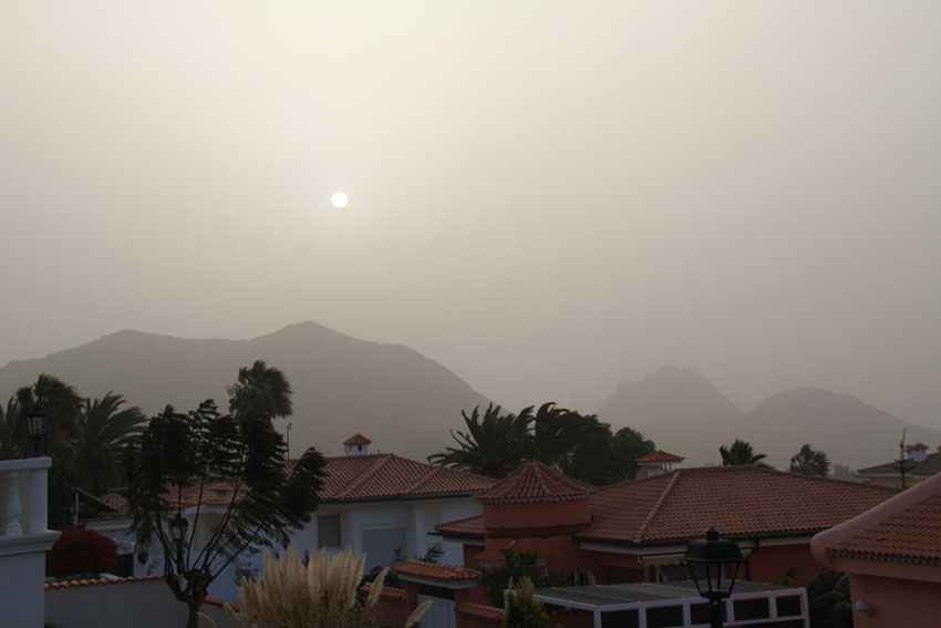 Vi har en tid lidit av ovanligt långvarig och svår "calima", damm i luften från Sahara. Så här såg det ut från vår terrass en morgon klockan 9.00.